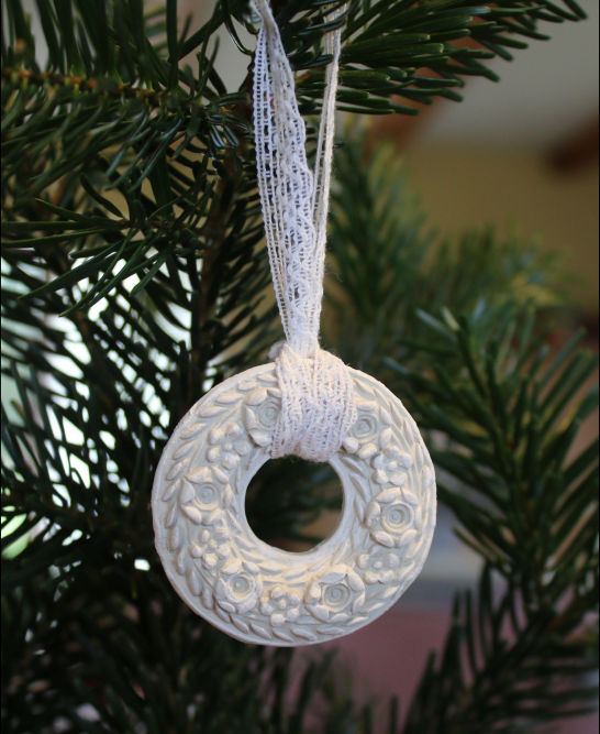 Ein besonderer Christbaumschmuck in Form eines Weihnachtskranzes aus luftgetrocknetem Ton mit einem feinen Spitzenband für eine schöne Weihnachtszeit.